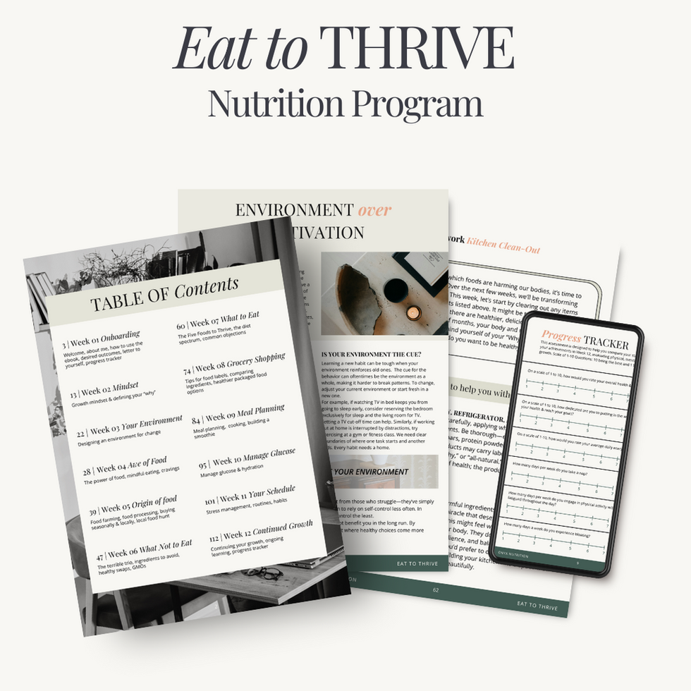 The Eat to Thrive Guided eBook is a step-by-step program designed to help you revolutionize your health by building sustainable habits and nourishing your body with real, whole foods. Whether you're feeling stuck, burnt out, or unsure where to start, this eBook will guide you toward lasting change.